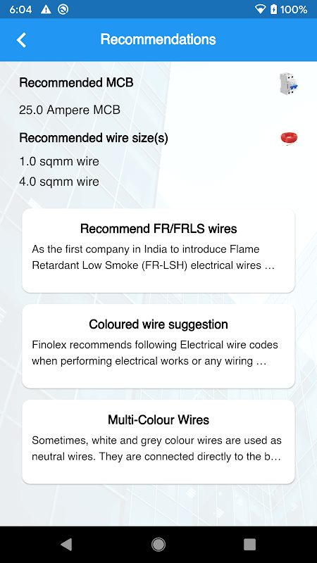 The application calculates the size of the cables based on the electric load that is keyed into the APP by the user along with other relevant details. Basis given inputs, it recommends the cable and MCB requirements for a project in the residential & commercials segments. It can also suggest the required cable rating for powering a submersible pump.