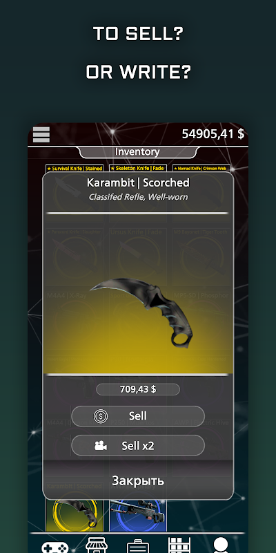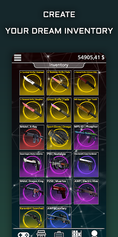 Download and play our game! Win various cs go skins from cases! Sell them to replenish your balance, or leave them in your personal inventory! Play roulette, place bets, double, or multiply your winnings up to 100 times! Endless inventory and a lot of interesting things are waiting for you in the game!