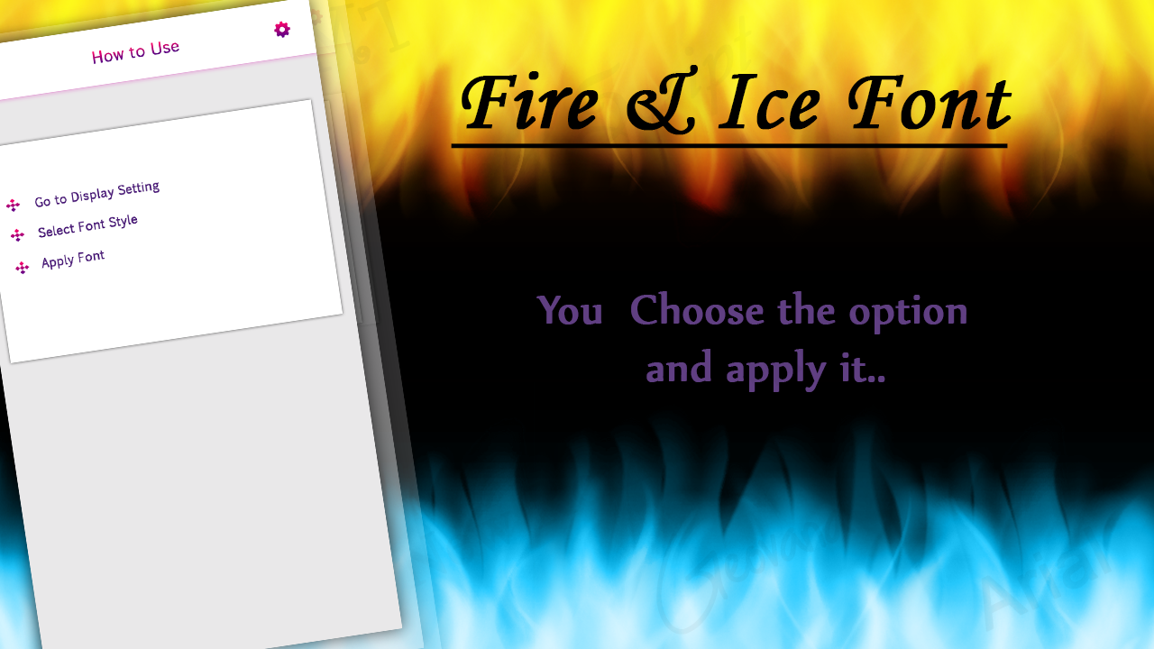 Try to using Fire & Ice Fonts and Fire & Ice Text with our smart Fire & Ice Font Style application. "Font Styles" contains many more free fonts for all devices to use it instead of your old font. Fire & Ice Font Style provides you with the ability to change your device font for free. Font Styles makes a great impression while using different fonts. Font Styles shows the fonts applicable to your device clearly so you can choose the font you like and apply. Font Styles should work on any smartphone that allows the custom fonts.
