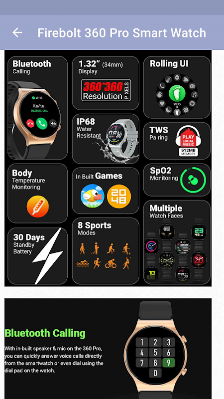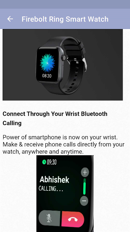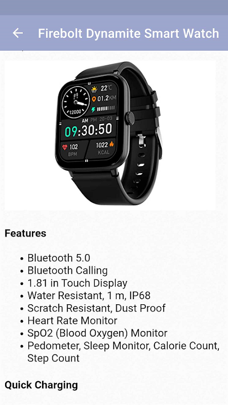 The Firebolt smart watch guide app contains information about features, setup, battery and charging by models.