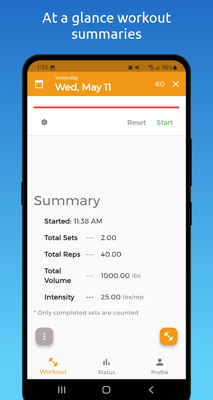 - View workout summaries and totals for each day using the draggable sheet on each page. Data includes total reps, total sets, and total volume