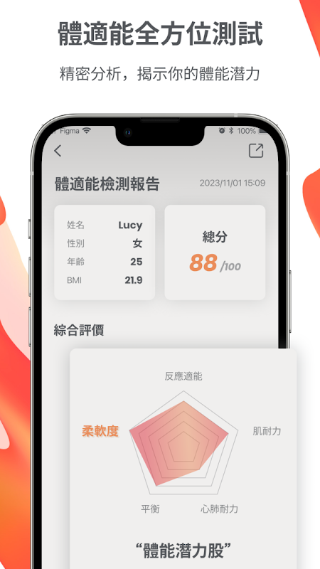 No complicated equipment required, FitSpec is by your side anywhere and at any time. A comprehensive test including reaction, flexibility, balance, cardiopulmonary and muscle endurance, which takes just 15 minutes to perfectly demonstrate your physical condition.