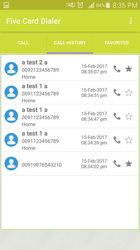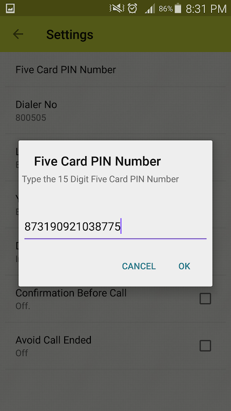 Five Card Dialer will help Five Card card user to make calls automatically. No need to remember pin. save the pin number in setting. Make calls from contacts, call history and favorite.