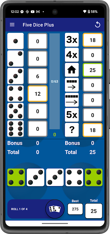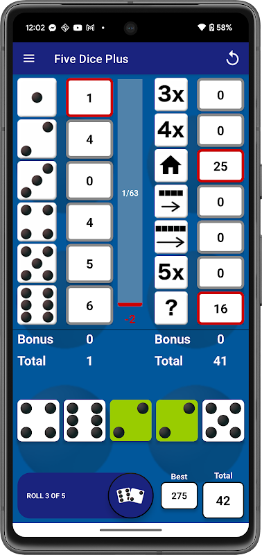 Five Dice Plus is a dice game similar to YAHTZEE*, but with a twist - you can accumulate unused rolls from each turn.