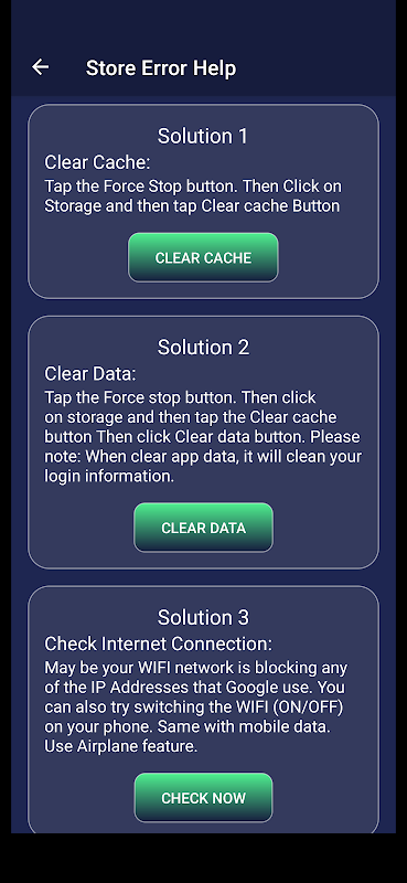 1. **Error Solver**: Quickly resolve Play Store errors and Play Service issues that might hinder your app experience. Get detailed explanations and step-by-step guides to fix common errors, ensuring smooth operation of your favorite apps.