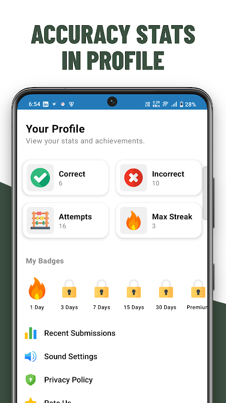 Accuracy Stats – Track your progress with stats on correct answers, attempts, and longest streak.