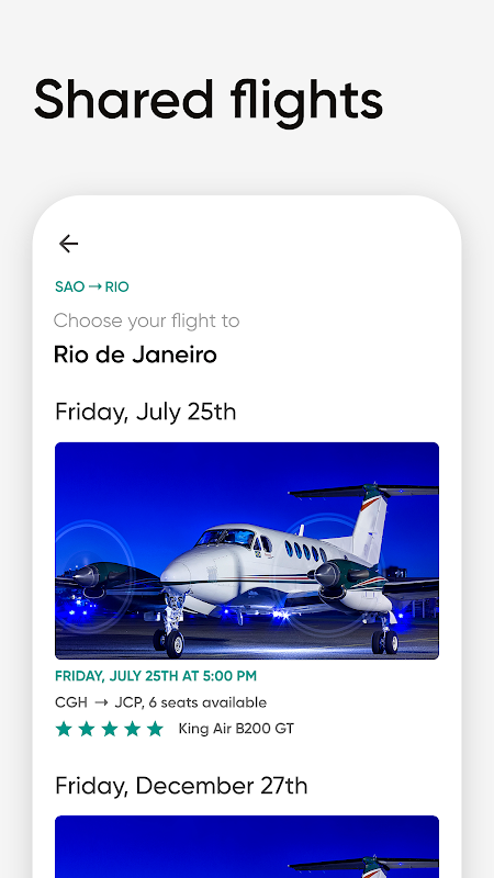 ◉ Shared flights: Browse seamlessly between available scheduled flights, with fixed prices and a guaranteed departure. Pay in-app.