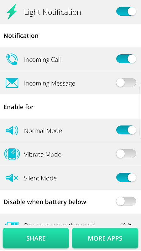 🔦 Enable Flash Alert on Call and SMS for each mode: