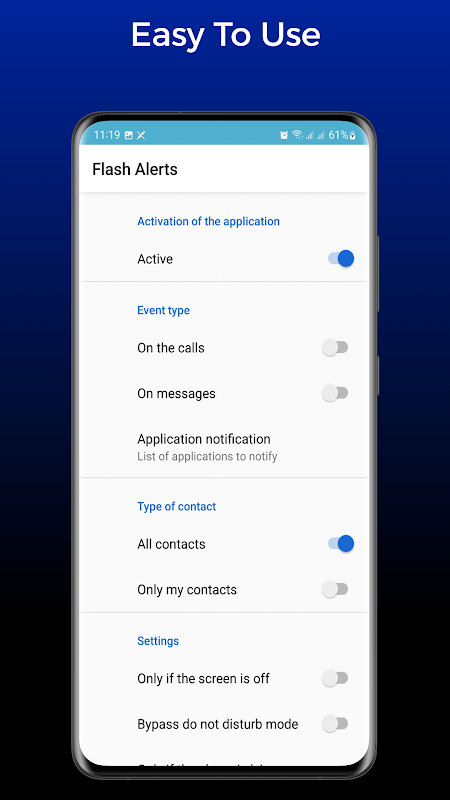 Flash Alerts is a must-have app for android phones. Blinking of LED flash alert on receiving a notification keeps you in touch with your loved ones at all times. Flash notification is better than phone rings when someone is trying to contact you, as you can set a pattern for the blinking of a flashlight for individual contacts. Save battery with flash on call and flashlight blinking on messages app.