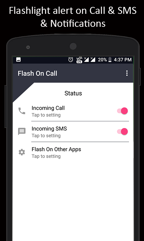 Flashlight alert is a smart app to alert you when you receive a phone call, text message, social notifications with the blink of your flashlight.
