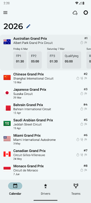 When the season is underway, the calendar for the current year might be subject to change as races are cancelled or rescheduled. As such, data may fail to appear in the app after a race has completed or the upcoming calendar event may not be accurate. We will endeavour to get this resolved as soon as possible!