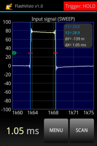 FlashVisio allows you to capture a visible or IR light pulse. Once the signal has been acquired, the app will show its waveform on the screen and automatically will calculate the pulse duration. Using the movable cursors you can perform manual measurements on the entire portion of the captured signal. Data and graphic screens can be saved in local memory or sent remotely via email. FlashVisio can also generate flash files compatible with LxMeter app.