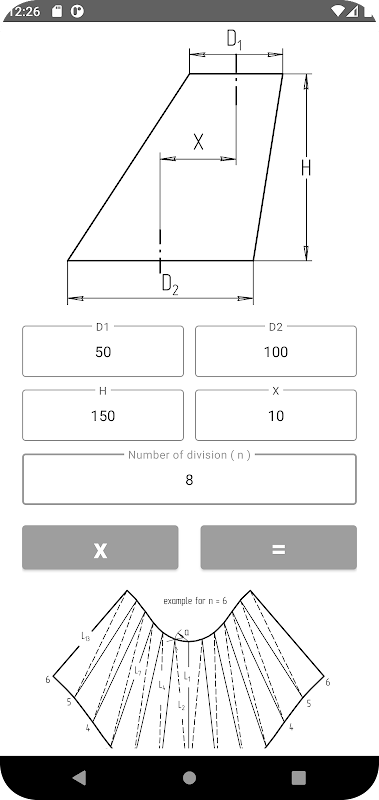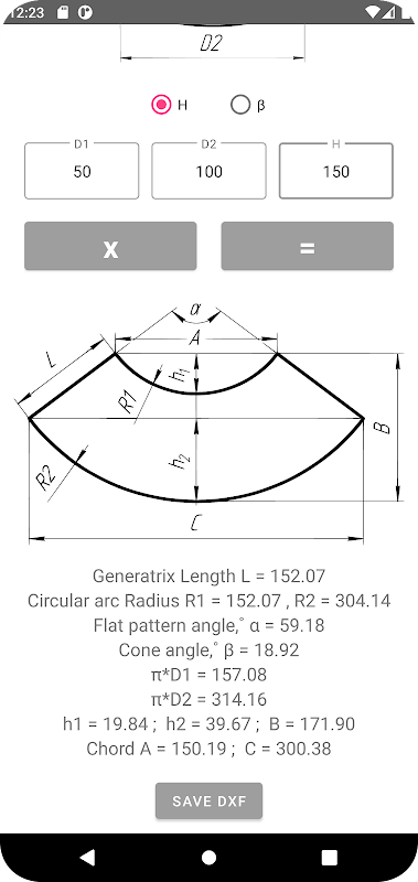 Flat pattern cone app is a very good tool for students, engineers and technicians. Using the sweep calculator, you can get all the necessary information about the cone.