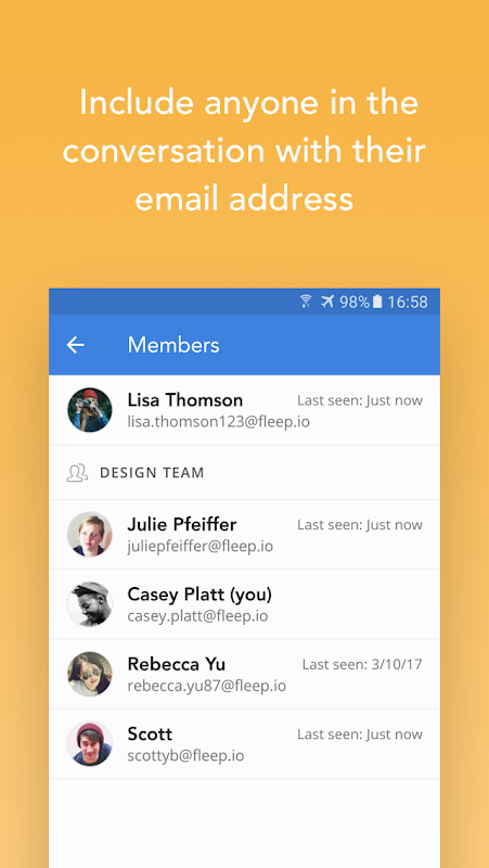* add people to conversations and teams with their email address - and they will receive messages as emails until they sign up to Fleep;