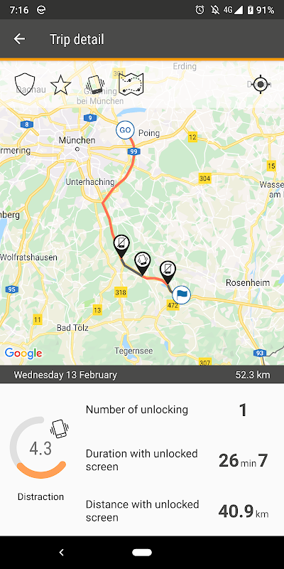 The app runs in the background and automatically detects the beginning and end of a ride. As a result, no manipulation with the smartphone must be made while driving.