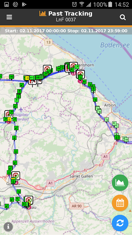 Follow the course of the individual vehicles by stages, time or a defined period. Coloured position markers highlight the measured speed ranges. Alerts as well as your comments can be viewed at a glance.
