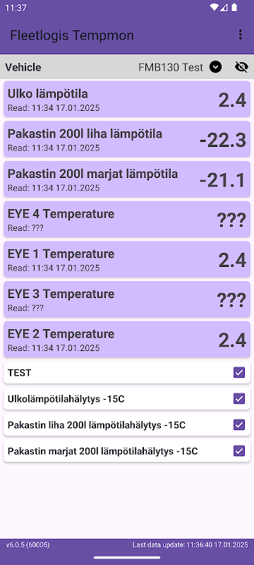 Fleetlogis TempMon is display application to show vehicle and trailer temperatures for the driver. Driver can set temperature monitoring ON/OFF meaning the user will get additional alerts if the temperature limit has been exceeded. Fleetlogis TempMon is part of mobile applications for the Fleetlogis Flex vehicle tracking product.