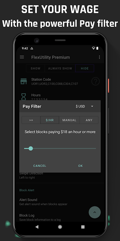 • YOUR START TIME - Flex Utility makes it easy to clock in when you want. Just enter your desired start time(s), and the app will only accept work that begins when you want to.