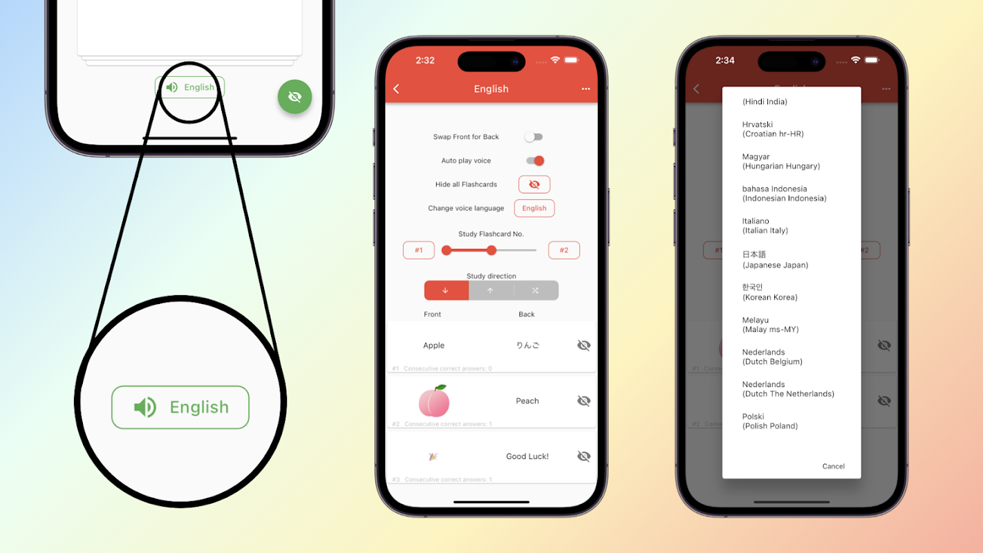 - **Customizable Study Settings** (playback direction, voice language, auto-play, etc.)