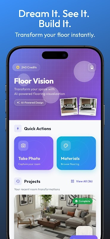 Transform your space with Floor Vision, the ultimate AI-powered flooring visualization app. Instantly preview how different flooring materials will look in your room — before making a purchase. Whether you're planning a home renovation or exploring design ideas, Floor Vision makes it easy to bring your vision to life.