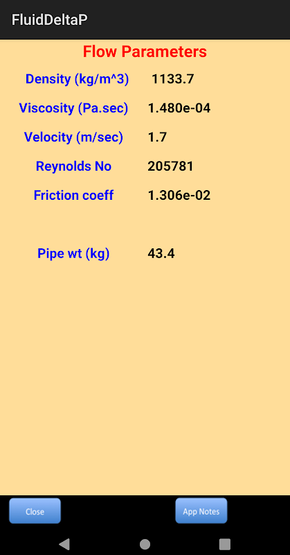 Fluid velocity, Reynolds number and pipe friction coefficient are computed as a function of pipe size, fluid density and viscosity. App has its own algorithm to compute the coefficient of pipe friction based on roughness factor and Reynolds number under turbulent conditions and for laminar it is purely a function of Reynolds number and irrespective of pipe roughness. For more accuracy users can edit the pipe roughness factor. For gases, additional data on sonic velocity is provided for a quick reference. This would also helps in determining pressure loss using other user’s methods.