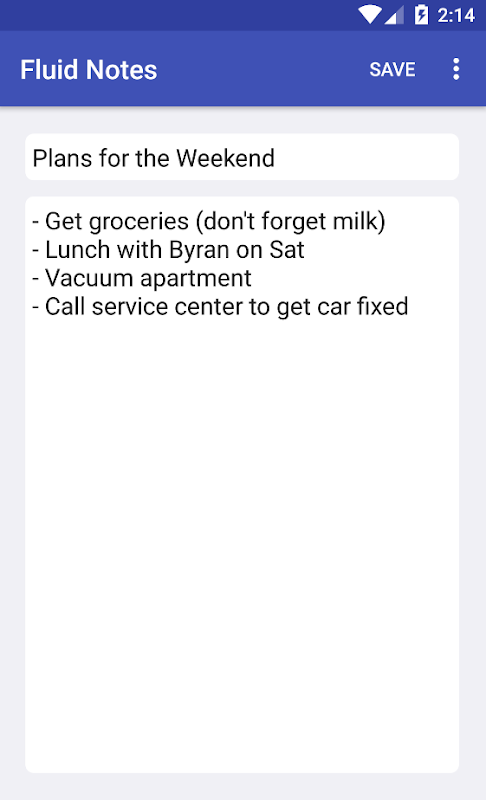 Fluid Notes is a simple note keeping and note sharing app. This app is extremely lightweight, and can be used to keep track of lists, memos, reminders, and any other notes that you may have to jot down at a moment's notice.