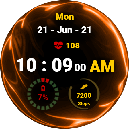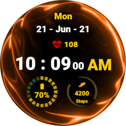 Simple digital watch face for Wear OS with animated fluid theme. With a glance at the watch face, you will be able to see the important information (The date, time, heart beat rate, number of steps, and battery percentage). The animated background creates a cool effect that will make you stand out from the others. Furthermore, the color of the battery indicator changes according to the battery percentage allowing you to immediately know where your battery level at without focusing on the details. Similarly, the number of steps will glow green when you reach your daily target. It is amazing yet not battery friendly. It supports always on display mode with 12- and 24-hour formats.