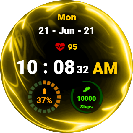 Simple digital watch face for Wear OS with animated fluid theme. With a glance at the watch face, you will be able to see the important information (The date, time, heart beat rate, number of steps, and battery percentage). The animated background creates a cool effect that will make you stand out from the others. Furthermore, the color of the battery indicator changes according to the battery percentage allowing you to immediately know where your battery level at without focusing on the details. Similarly, the number of steps will glow green when you reach your daily target. It is amazing yet not battery friendly. It supports always on display mode with 12- and 24-hour formats.
