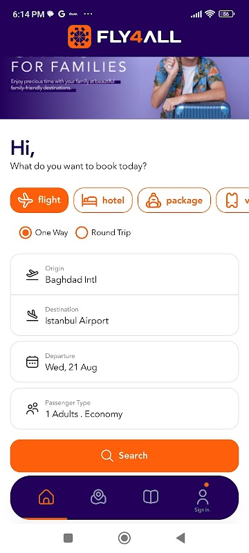 Download the innovative Fly4all application to provide comprehensive travel reservations services. It aims to facilitate the travel planning process by providing an integrated set of services that include: