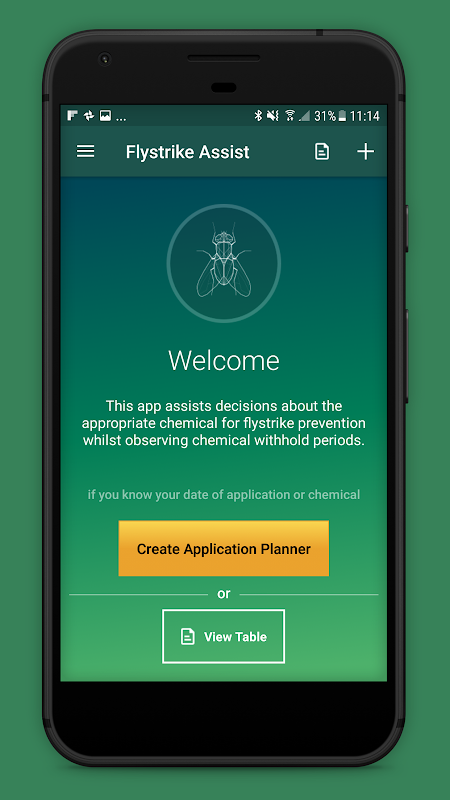 This app assists decisions about the appropriate chemical for flystrike prevention whilst observing chemical withhold periods. You can view the main chemical groups and the relevant wool, local slaughter and export interval date for each chemical. The app then lets you set an application date and prepares a timeline for that application.