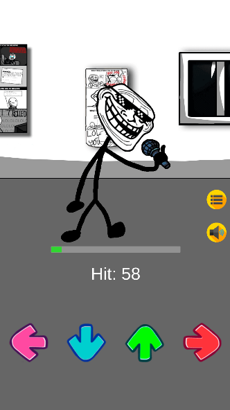What to do in the game? In FNF Trollface Mod Test you need to create your own unique and unrepeatable track. To do this, use the four arrows on the screen of your device. By clicking on one of the arrows, the Trollface emits a certain sound and makes a certain movement. By clicking on the arrows, you can create your own unique track every time. And you can make each of your tracks even more cool. In the game you can choose different character mods and different tracks, on the basis of which you will compose your hits. You can also turn off the music in the game to listen only to the voice of Trollface.