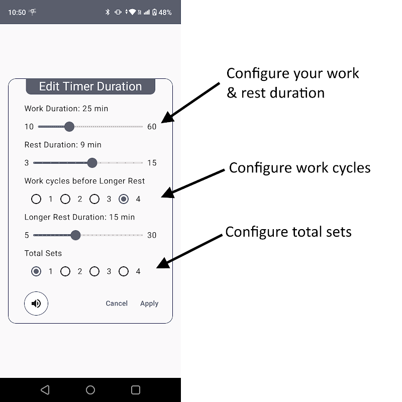 Set your work and rest durations to match your current tasks, choose your preferred ringtone, and press "Start" to begin the timer. You can also customize the number of cycles to repeat. When the work session ends, the app alerts you to take a break, giving you time to relax and refocus before diving back into your tasks