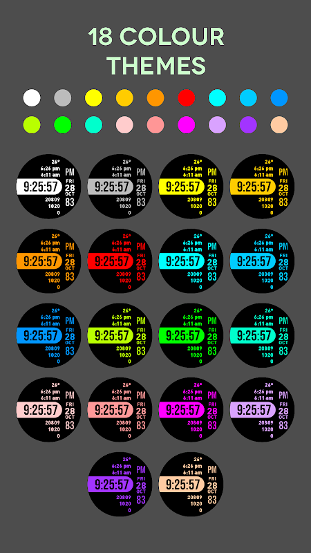 2. 18 different color choices. Please press and hold on the watch face to customize the watch face color.