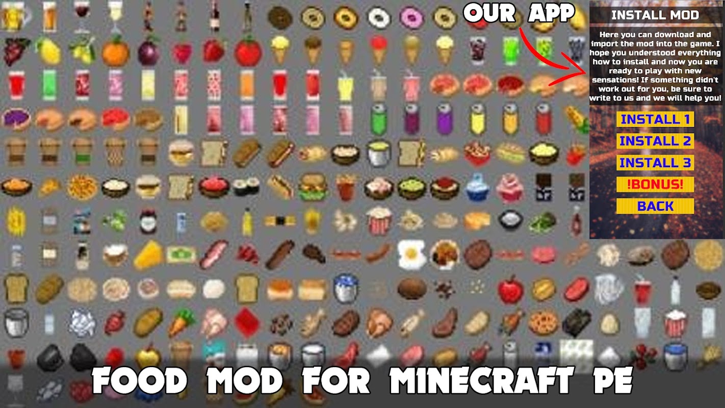 ❗❓Food Mod for Minecraft PE❗❓😋The lack of food in MCPE is getting weaker with each update. Players have already learned how to build farms and actively grow mobs or plants. One way or another, the Food's Plus mod will help you survive. The more food in the game, the easier it will be to survive. The assembly includes more than 600 types of food. It has everything from baked goods to full meals. Most of them are available in survival mode.😀