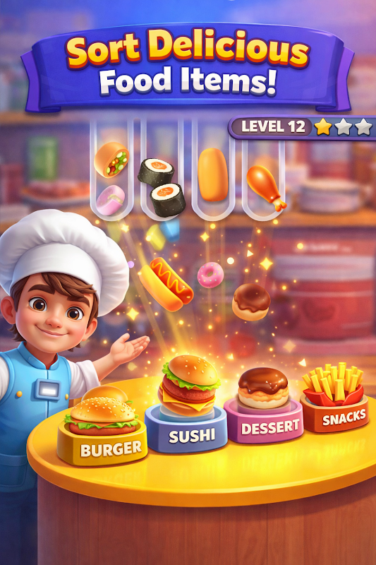 Step into a world filled with tasty treats, busy restaurants, and endless sorting fun. Your mission is simple but incredibly addictive: sort food items into their correct categories and plates until every tray matches perfectly!