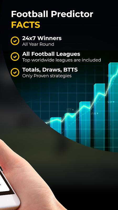 Football Predictor includes verified performance and proven strategies for all major football and soccer leagues. With 24/7 winners available all year round and support for totals, team totals, and BTTS, you can trust that the information you receive is reliable. We've even included our new improved strategy 3.1 in the app to help you get even better results. In addition, we've added convenient features like push notifications, a potential bets section, and live scores to keep you up to date and never miss out on a game.