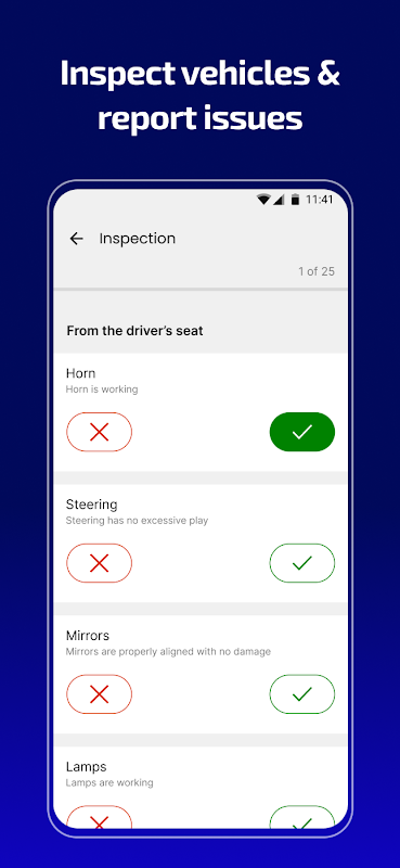 • Issue Reporting. Quickly and easily report issues with your vehicle to your company either during the daily check or at any time during the day.