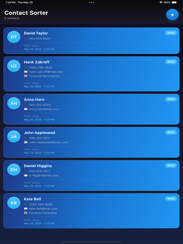 TimeSorted Contacts automatically orders your address book by the date you first added or last updated a person—so your newest leads, the friends you just met, or that client you last spoke with are always at the top.