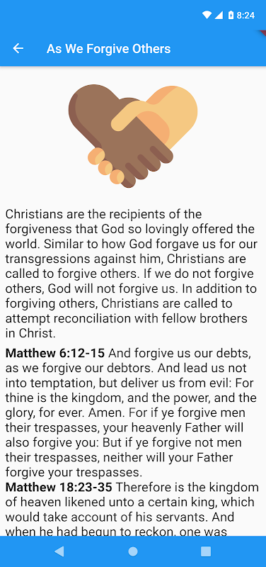 This app is a concise reference of bible scriptures about forgiveness. Learn what it means to forgive and how God can forgive you of your sins against him. Learn about the redemptive work of Jesus Christ and why it is important for Christians to forgive others.