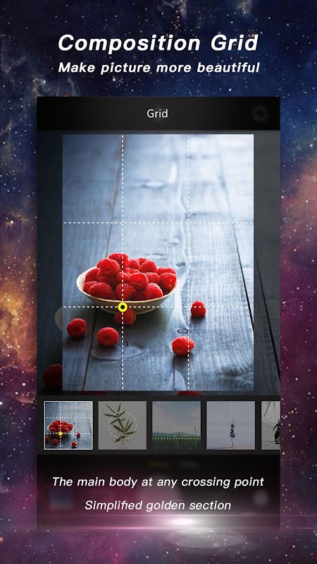 24 types of the Composition Lines and SLR Photographer's Pattern. Including classic 9 grid, trisector, diagonal, horizontal, triangle, convergence, extension, center and etc. Meet the Close-Up Scene needs. Find the Right Angle and True Intention of Photographic Work By Yourself.
