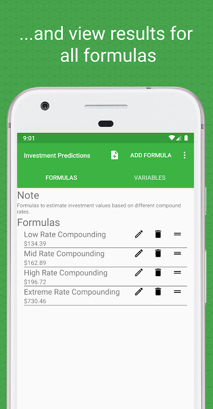 FormulaPro is a custom formula calculator. You enter the formulas and values, the app will do the calculating! Group formulas together to share variable values across multiple formulas.