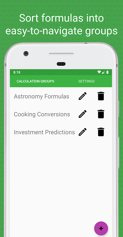• Calculation groups: Group formulas together to share common variables. Enter variable values once and see the results of all formulas in the group.