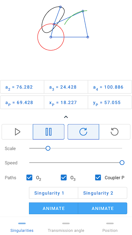 Users can input the dimensions of the fourbar linkage, such as the lengths of the links, the coupler length and the angle respect to the connected bar, and observe how the mechanism moves and operates accordingly.