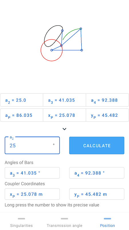 It also allows users to input specific angle for the crank position, enabling them to observe the resulting position of the linkage.
