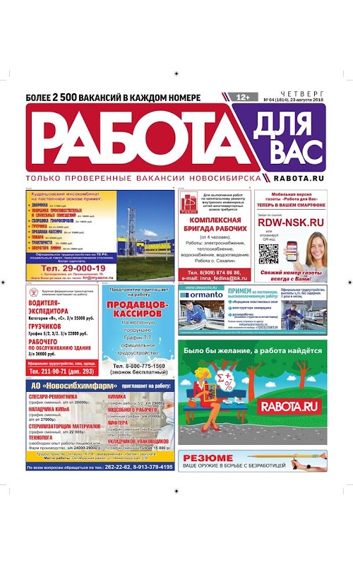 Travailler pour vous - le journal le plus populaire pour trouver du travail à Novossibirsk. Pendant 18 ans, avec l'aide des habitants de la ville et de la région de trouver leur travail. La nouvelle édition du journal avec les propositions les plus pertinentes sur les lundis et jeudis. Chaque numéro contient seulement prouvé emploi fiable des employeurs. Avec le spécialiste de la presse peuvent trouver un emploi dans ne importe quelle industrie - l'industrie, de la fabrication, de la banque et le commerce, etc., et le travail divisé par les sections pertinentes. Il suffit d'appeler l'annonce ou d'un emploi, vous trouverez un nouvel emploi aujourd'hui. Recherche par le travail de la presse pour vous - ce est rapide et pratique.