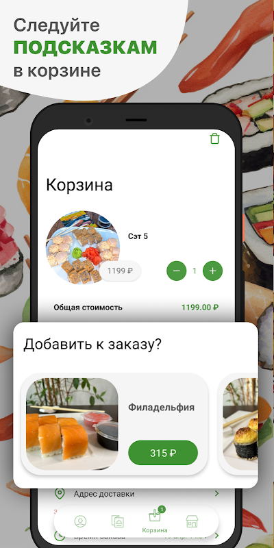 Comment passer une commande dans l'application « Autorolls Asia » : sélectionnez les articles qui vous plaisent dans le menu, ajoutez-les au panier et accédez à l'écran de paiement (en cliquant sur l'icône du panier).
