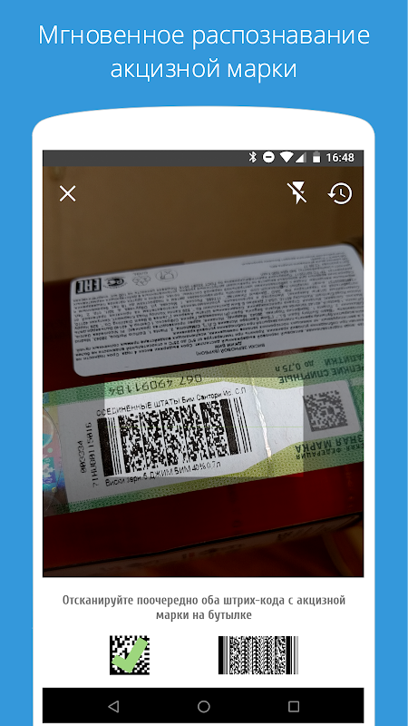 Exécutez l'application et numérisez les codes à barres de l'étiquette d'accise sur la bouteille. L'application vérifie les données à la base de données EGAIS Service fédéral de réglementation du marché de l'alcool (FSRAR) et affiche le résultat.