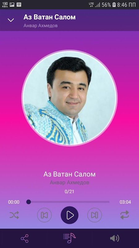 Biographie: Akhmedov Anvardzhon Khakimdzhonovich est né le 13 novembre 1984 dans la famille de l'acteur. Il a étudié à l'école secondaire n ° 6 et à l'école de musique n ° 1 de la ville de Khujand. 2000 est entré au Collège de musique. "Sodirkhon Gafiz", où il jouait de l'instrument folklorique gizak. Il est entré et diplômé de l'Université d'État de Khujand (Faculté d'art - Département de chant traditionnel) 2002-2007.