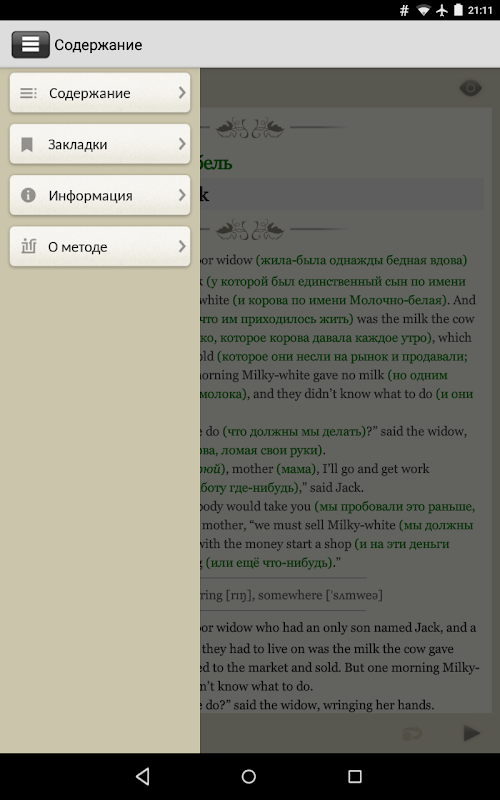 Annexe favorise le développement efficace de la langue anglaise, peut servir de complément au programme d'études. Conçu pour les étudiants de langue anglaise apprenants eux-mêmes, mais aussi pour quiconque se intéresse à la culture anglaise. Dans le même temps la lecture du texte, vous pouvez écouter une piste audio, ou tout simplement utiliser l'application comme un livre audio.
