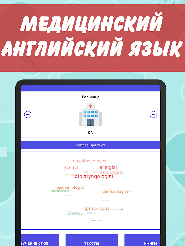 Vous pouvez ajouter vos propres mots avec des exemples et créer des dictionnaires séparés, y compris pour n'importe quel sujet. Il vous aidera à apprendre l'anglais médical de manière dynamique.